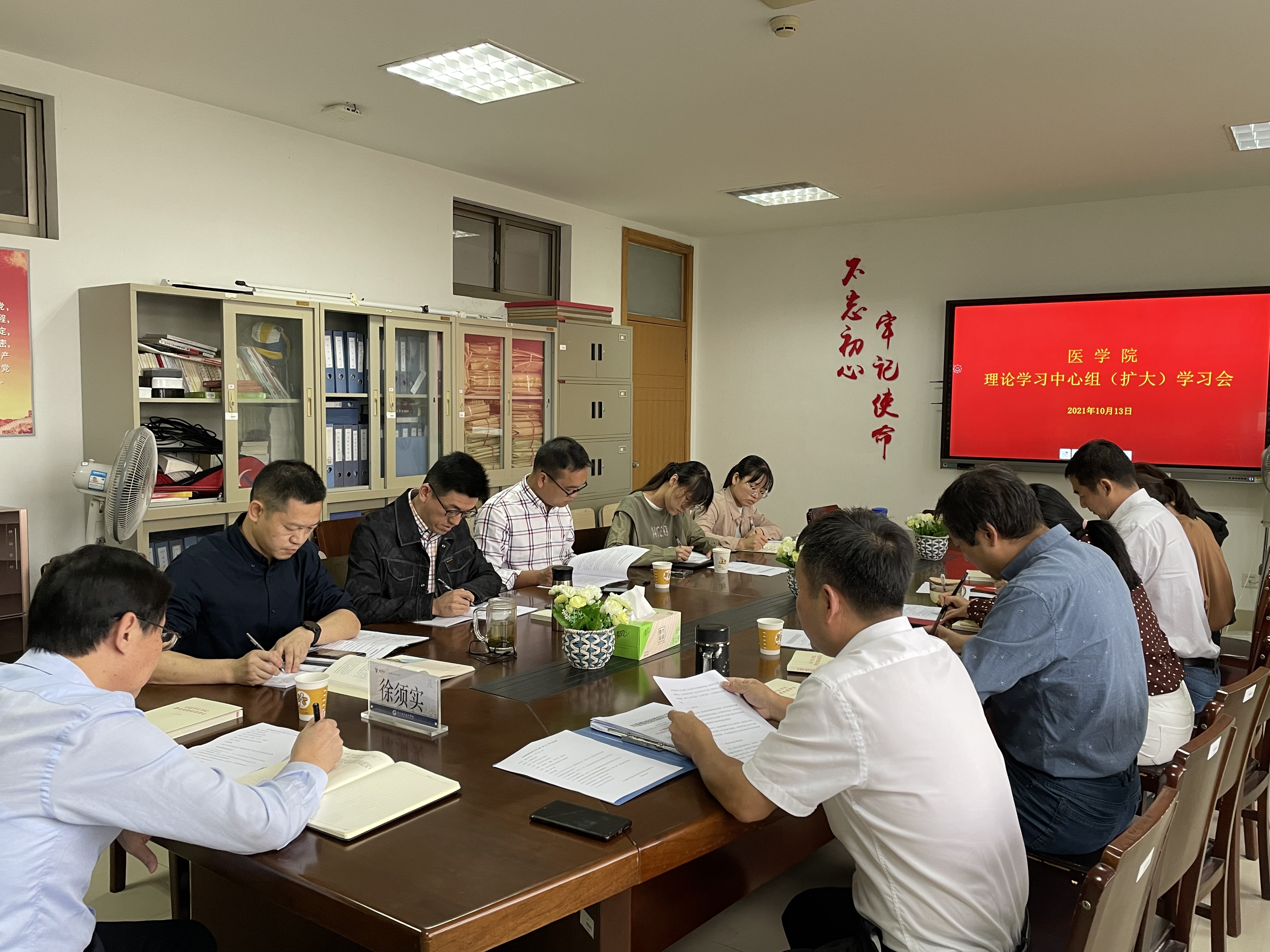 10月13日下午,医学院党总支召开理论学习中心组(扩大)学习会,中心组全体成员参会,邀请校党委书记徐须实巡听,各党支部委员、综合办公室主任、学工办主任及组织员旁听,会议由党总支书记余文富主持。