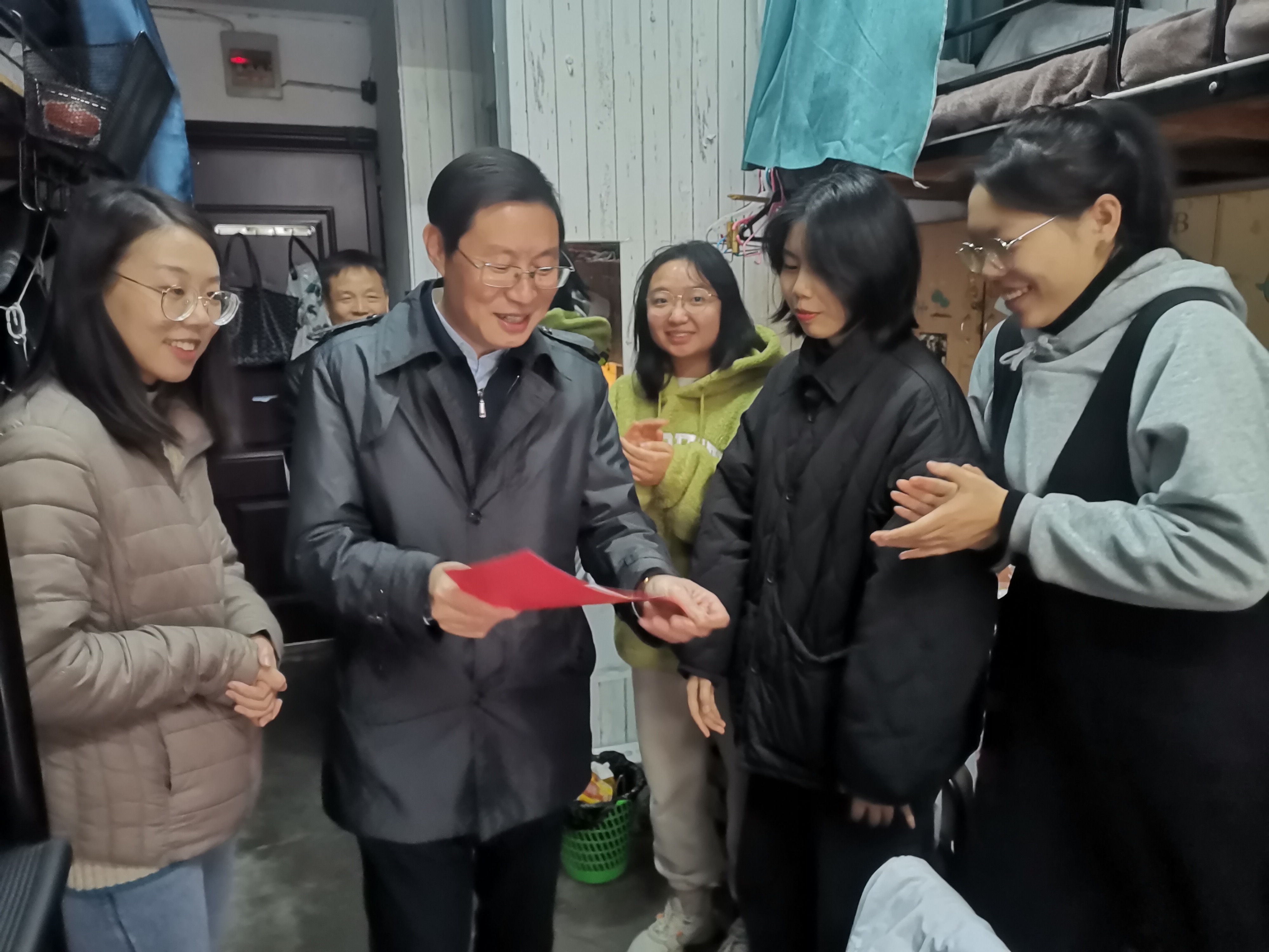 一走进寝室,徐书记就向同学们问好,并告诉大家一个好消息:3132寝室获得学校2020-2021学年“学风优良寝室”,并现场颁奖:把奖状交到寝室长手中,同学们兴奋地热烈鼓掌庆祝。