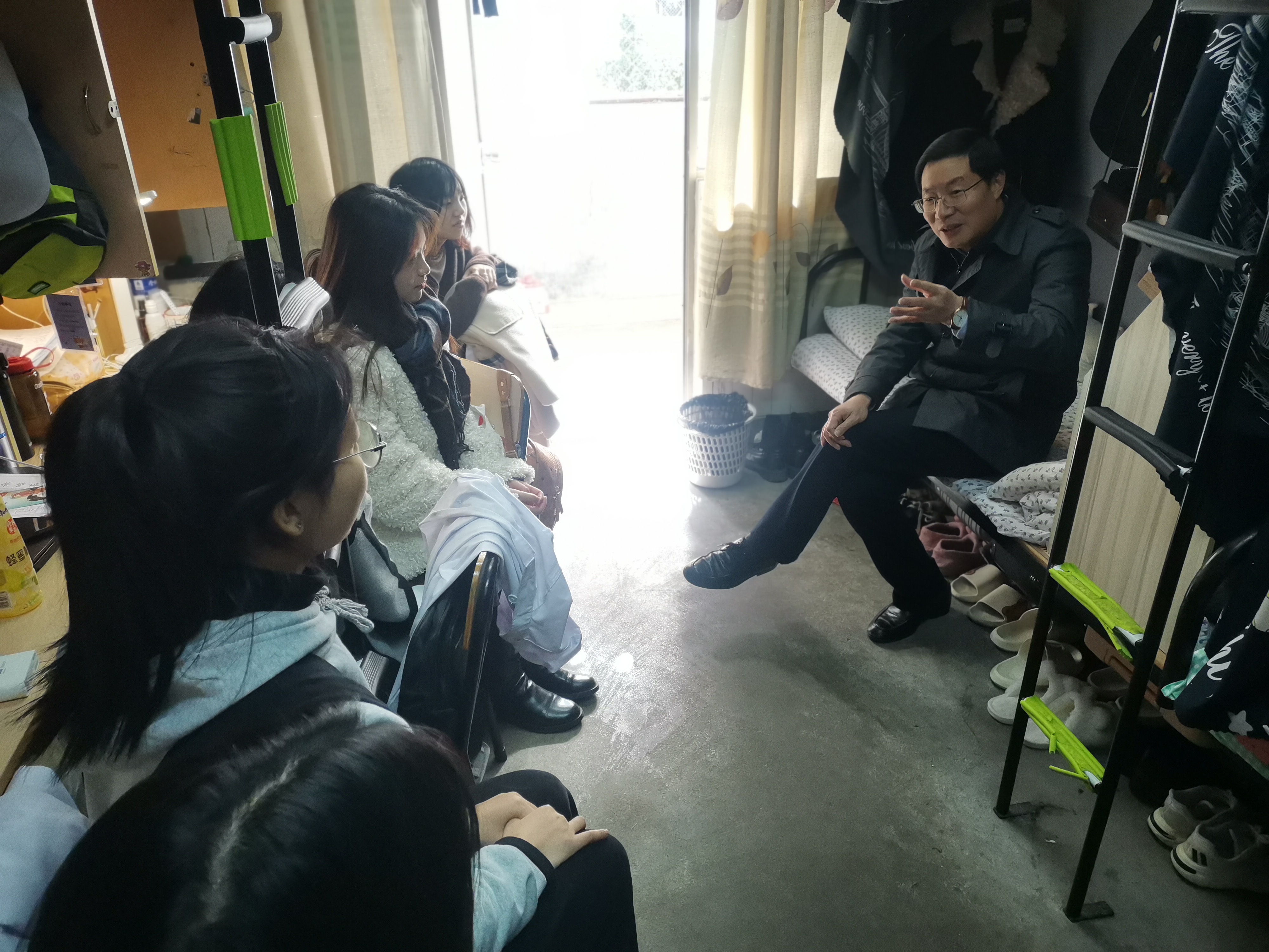 11月24日中午,学校党委书记走进联系寝室--医学院2020级护理专业2班3132寝室,医学院党总支书记余文富、班主任陪同走访。