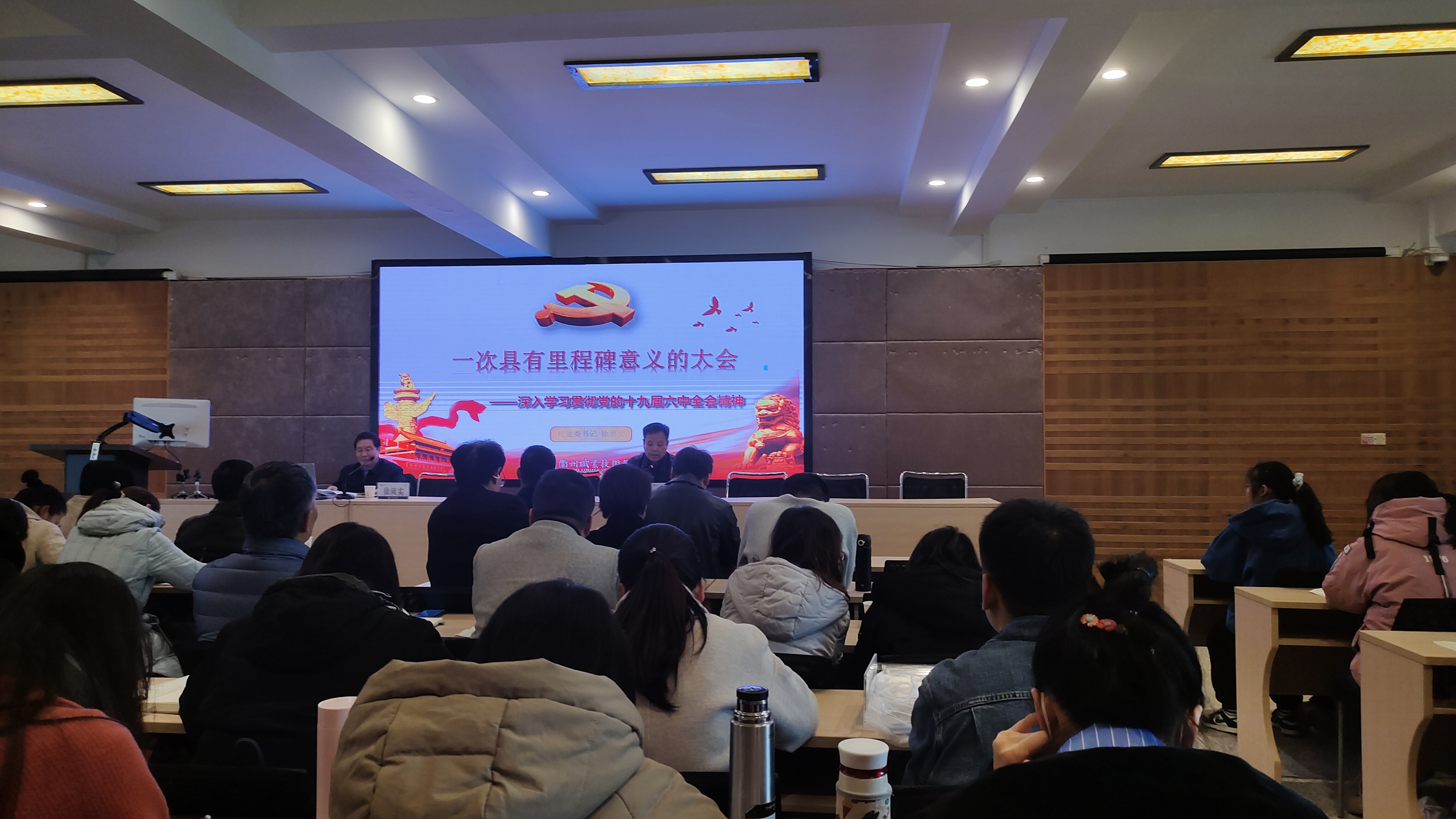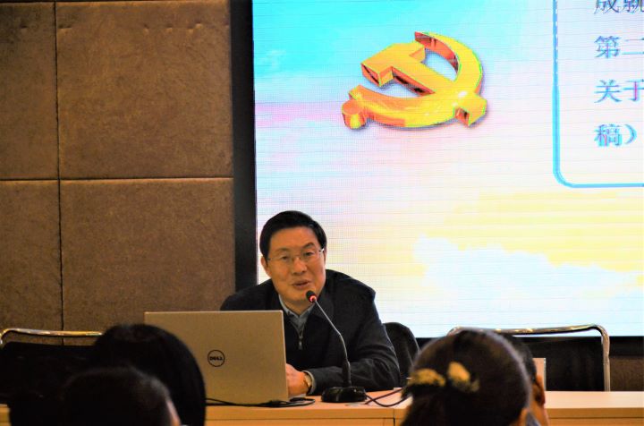 徐须实书记从“会议概况”开始,讲到党的十九届六中全会“主要精神”,他强调十九届六中全会是在我们党成立一百年之际,党领导人民实现第一个百年奋斗目标、向着实现第二个百年奋斗目标迈进的重大历史关头召开的重要会议。习近平总书记的报告、重要讲话和全会审议通过的《中共中央关于党的百年奋斗重大成就和历史经验的决议》,全面回顾了党走过的百年奋斗历程,总结了党的百年奋斗重大成就和历史经验,着重阐释了党的十八大以来党和国家事业取得的历史性成就、发生的历史性变革,对实现第二个百年奋斗目标提出了明确的要求,是一篇马克思主义纲领性文献。传达好、学习好、宣传好、贯彻好习近平总书记重要讲话精神和全会精神是当前和今后一个时期学校各级党组织一项重大政治任务。我们要提高政治站位,认真学习领会,坚决贯彻落实,自觉把思想和行动统一到党中央的决策部署上来,把智慧和力量凝聚到落实全会提出的各项政治任务上来。