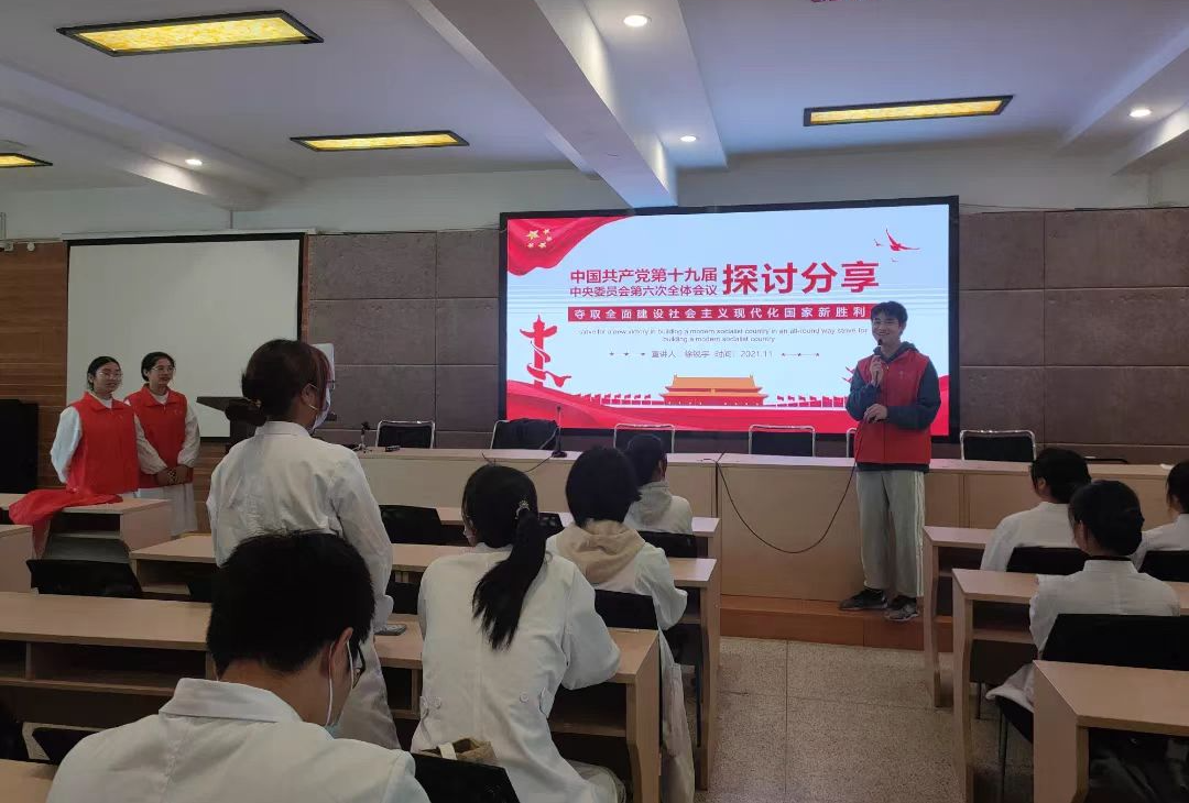 徐须实书记进医学院宣讲十九届六中全会精神1次,学“习”小组对徐须实书记的宣讲进行了深入学习、讨论,撰写学习心得42篇。围绕十九届六中全会精神及《中共中央关于党的百年奋斗重大成就和历史经验的决议》学习主题,医学院领导班子进班级,校8090宣讲团进支部,00新时代理论宣讲团进班级、进寝室、进社团、进食堂,进行全方位、全员宣讲,学习热潮持续涌现。