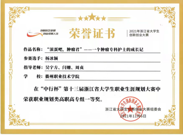 在2021年浙江省高职院校教学能力比赛中获三等奖2项。在2021年浙江省高职院校教学能力比赛校级选拔赛中获二等奖2项、三等奖1项。