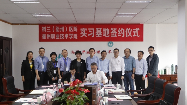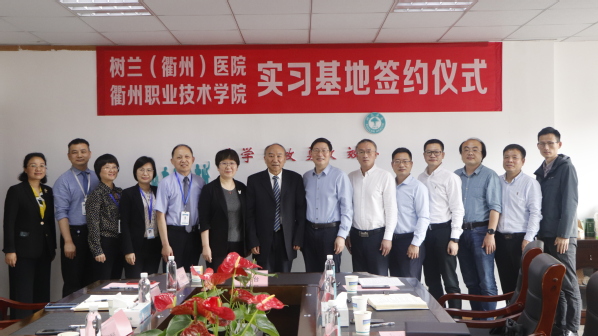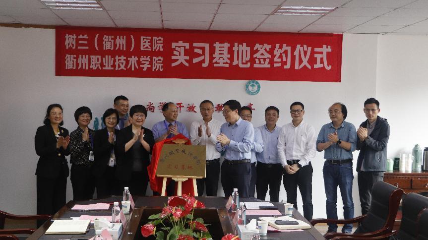 调研会上,徐须实书记与冯志仙副院长为实习基地揭牌;何百通副校长与树兰(衢州)医院副院长朱玉萍签署了实习基地协议,在场领导一起见证。