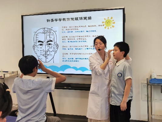 课程的主题是“寻访中医文化,传承中医国粹”。首先进行的是“针圣爷爷教你做眼保健操”。老师们根据孩子们常做的眼保健操,向学生们介绍中医特色眼保健操的由来,眼睛周围的穴位,引发学生们对中医的兴趣。针灸推拿专业师生们现场指导学生们攒竹穴、睛明穴、四白穴、太阳穴、足三里穴的定位,并介绍了针刺技术的优势。陈老师还讲解小儿推拿中的捏脊手法和经络拍打操两个部分。针灸推拿教师给孩子们演示捏脊手法的操作,将经络拍打操动作拆分讲解后,带着同学们一起操作学习。
