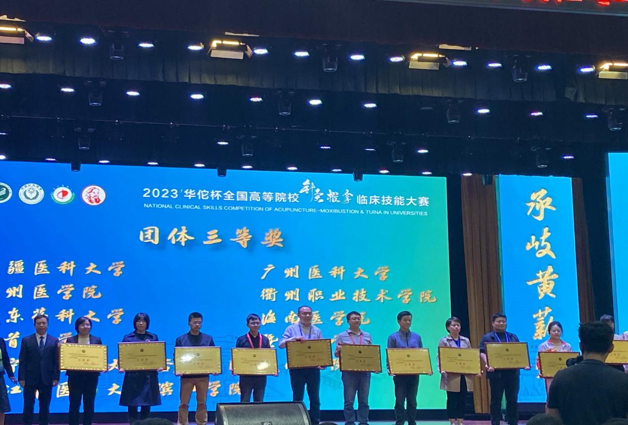 10月13日至15日,由中国针灸学会、全国中医药高等教育学会主办,山东中医药大学承办的2023华佗杯全国高等院校针灸推拿临床技能大赛在山东济南顺利举行,来自全国42所中医药高等院校,84支参赛队伍开展为期2天的精彩角逐。我校毛旭清、刘西平、封鹭琪、杨飞教师和方诗意、葛浩锟、徐慧斌、刘云同学组成的参赛团队最终喜获团体三等奖。