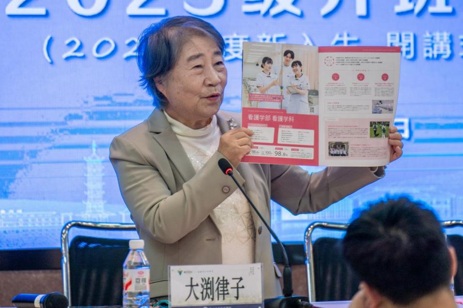 姚水洪代表学校向远道而来的大渕律子教授表示热烈欢迎,向成功考入中日合作班的全体新同学表示衷心祝贺,并向为项目付出辛勤努力的双方教职员工致以诚挚感谢,并对2025级新生提出三点期望:一是要志存高远、心怀仁爱,夯实专业基础,以爱心、耐心、细心和责任心服务患者;二是要融会贯通、博采众长,主动打破文化壁垒,融合中日护理精华,成长为兼具本土根基与国际视野的复合型人才;三是要克服困难、勇于挑战,在语言学习与文化适应中锤炼沟通能力,拓展思维格局,为未来职业发展奠定基础。他表示,学校将全力支持合作项目发展,为学生创造优质学习条件,并期待与日本佐久大学持续深化合作,共同将本项目打造为中外合作办学的典范。